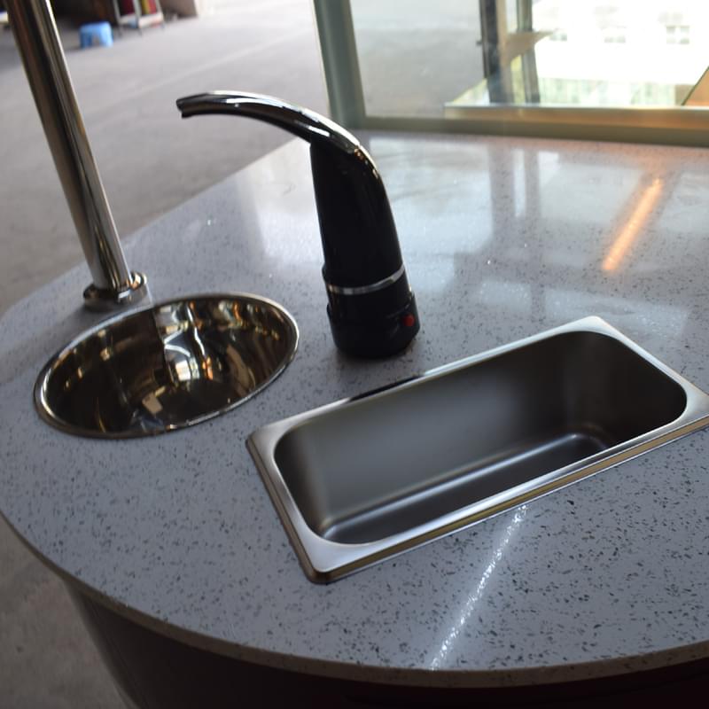 3) karat kotak dengan karat dan pengiklanan pelekat. Kaunter dihiasi dengan bintang perak batu putih, dan hangat MEMBAWA lampu kalis air di lemari dipamerkan.